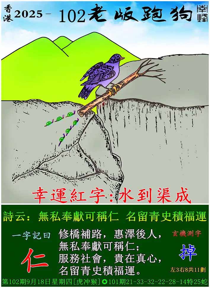 | 主题 :102期老版跑狗一字記之曰:【仁】 玄機測字:《掉》 |