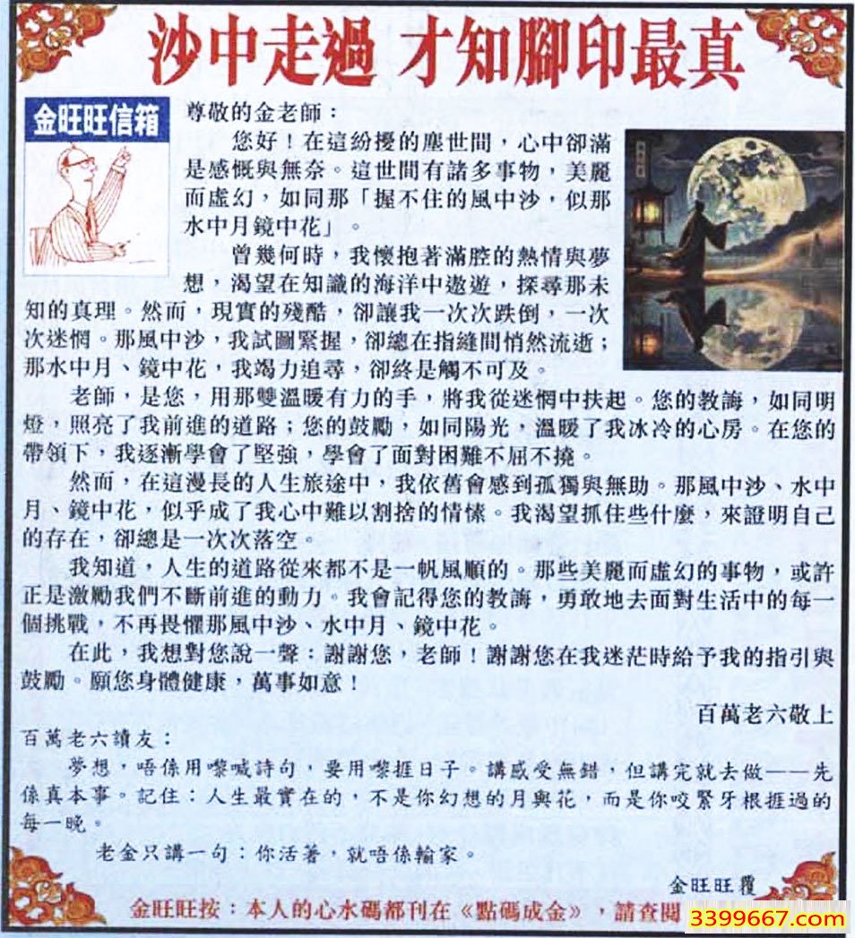 主题 :001期:金旺旺信箱彩民推荐→→《沙中走過 才知腳印最真》