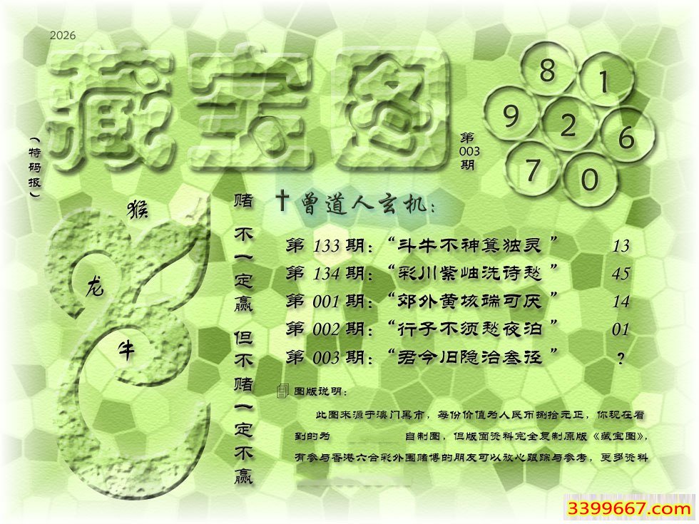 | 主题 :003期藏寶圖 新:君今旧隐治叁泾 老:交游相见休相问 禁:狗 禁:3尾 |