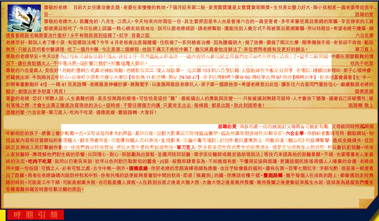 【2】.尊敬的老總大人、我屬兔的,八月生,江西人。今天特來向你寫信一份,其主要原因是本人也是香港六合的一員受害者,多年來蒙受黑莊黑網的欺騙、辛苦掙來的工資都被黑莊給吃了、今日在網上認識一熱心網友給我地址,說可以跟老總傾訴,請老總幫助,還能找到入會方式不再被黑莊黑網蒙騙,所以特寫信。希望老總不嫌棄,順便看看網路名稱需要改什麼好!水平有限就寫到這裡了。紅字:首善之區  六合玄學