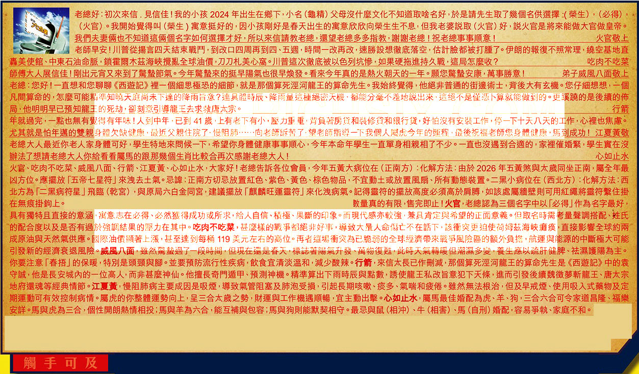 【1】.老總好:初次來信.見信佳!我的小孩2024年出生在鄉下,小名、(龜精)父母沒什麼文化不知道取啥名好,於是請先生取了幾個名供選擇:(榮生),(必得),(火官)。我開始覺得叫(榮生)寓意挺好的,因小孩剛好是春天出生的寓意欣欣向榮生生不息,但我老婆説取(火官)好,説火官是將來能做大官做皇帝。我們夫妻俩也不知道這俩個名字如何選擇才好,所以來信請教老總,還望老總多多指教,谢謝老總!祝老總事事順意! 火官敬上
