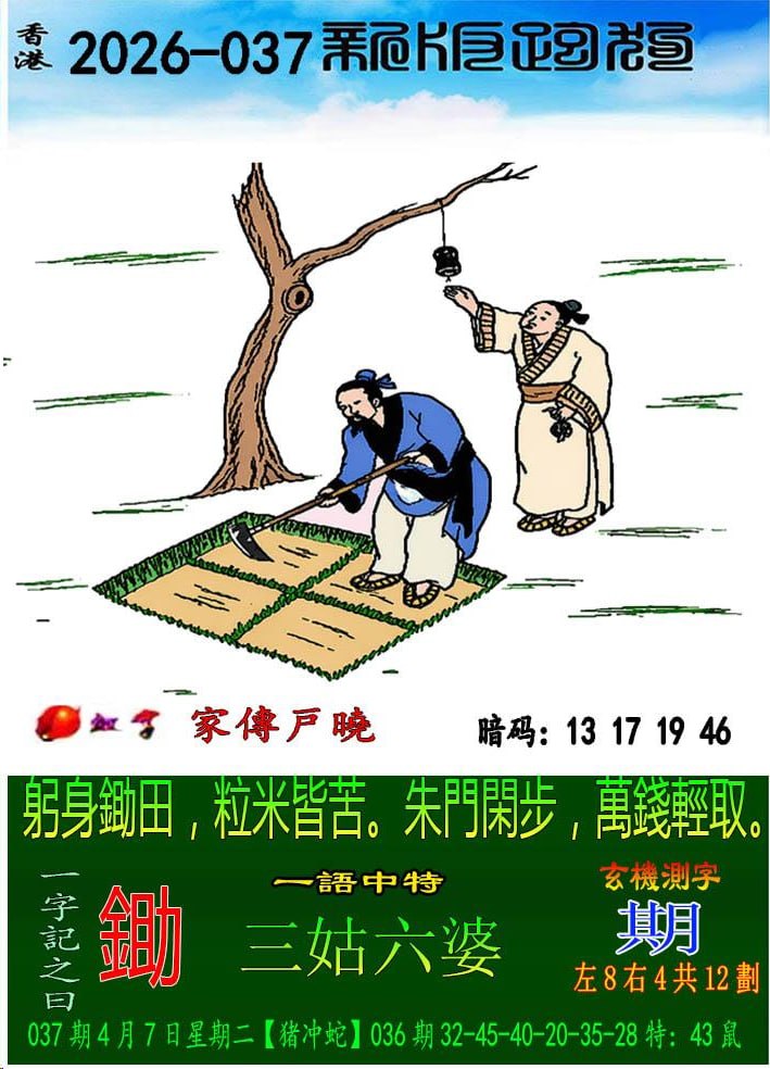 037期:新版跑狗一字記之曰【鋤】 玄機測字:【期】